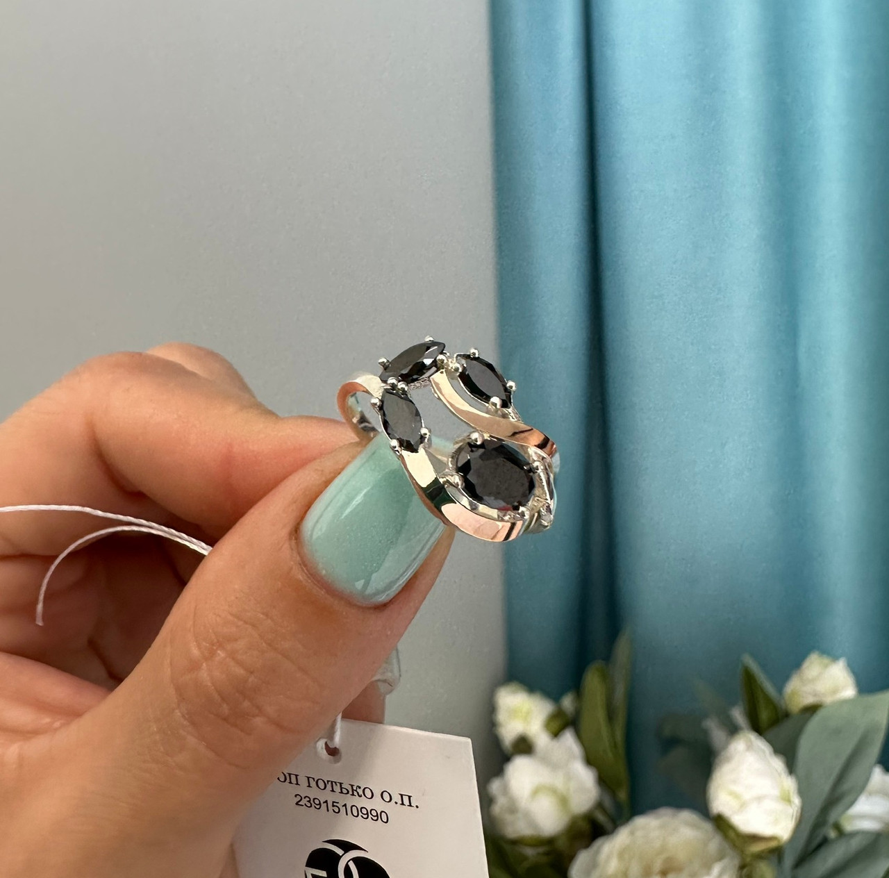 Каблучка «Амстердам» — це елегантне поєднання срібла та золота, доповнене витонченими чорними камінцями, які надають прикрасі загадковості та виразності. Чорні камені додають контрасту та глибини дизайну, а золоті вставки привносять тепло та благородство.