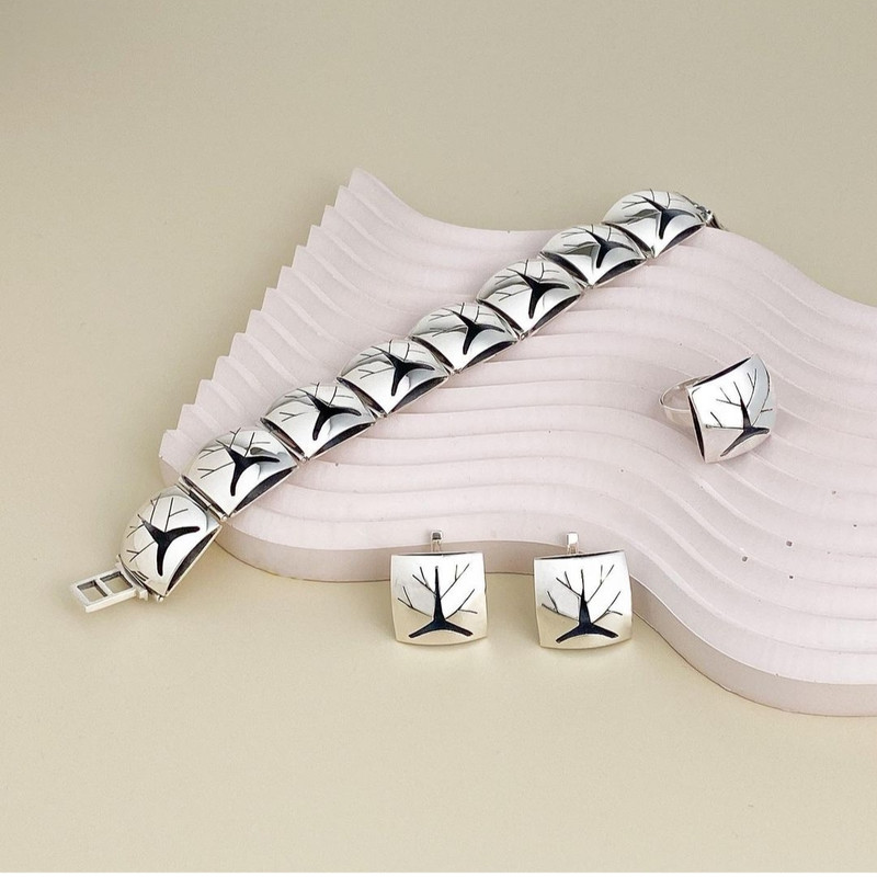 Стильний срібний комплект у формі об’ємного квадрата без каменів. Прикрашений рельєфним зображенням дерева — символом життя, сили та гармонії.