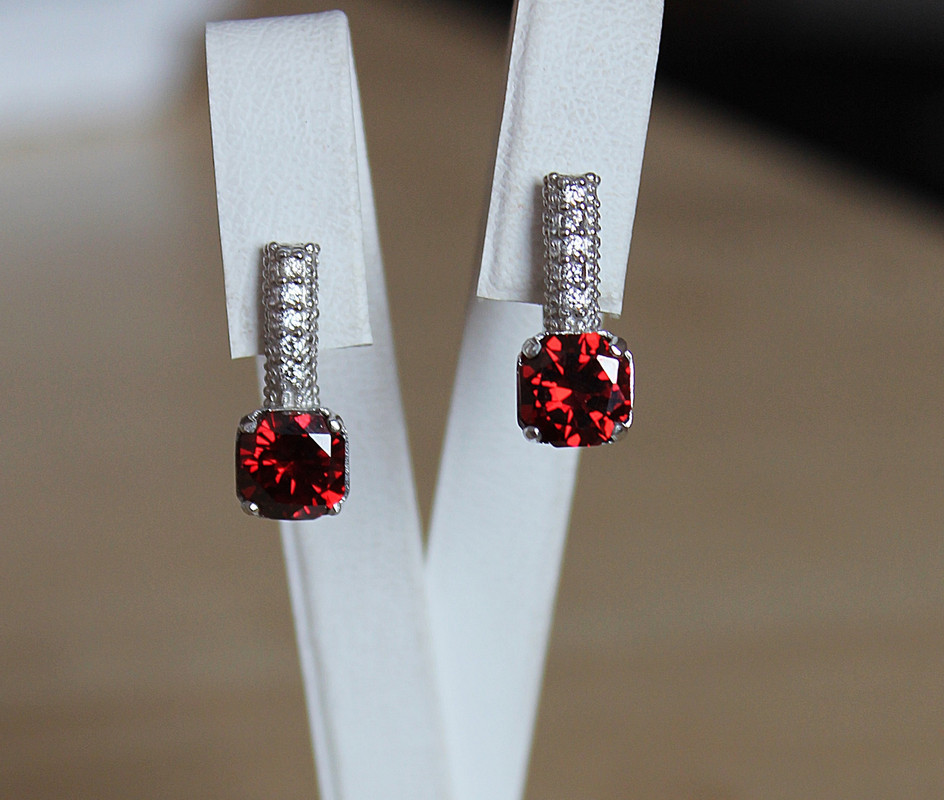 Неперевершеність цих сережок зводить з розуму всіх оточуючих. Яскравий колір червоного каменю надає привабливості та чарівності. Такі сережки будуть відмінним атрибутом до вечірнього вбрання, а додаткові білі камінці на виробі додадуть блиску Вашим очам. Виготовлені зі срібла 925 проби та покриті родієм.
