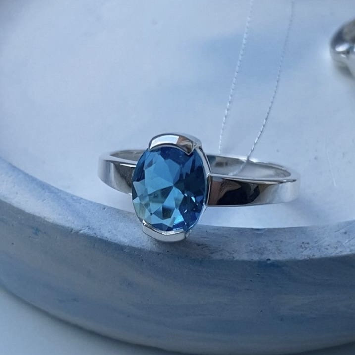 Срібна каблучка з родієвим покриттям класичної форми. Виріб виконаний з інкрустацією блакитного каменю. Родій захищає поверхню срібла від потемніння і надає йому додаткового блиску. Відгуки покупців свідчать про те, що срібло родоване дуже практичне і довговічне в повсякденному носінні. Розміри від 16,5 до 19,5.