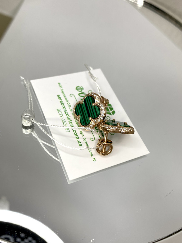 Срібні сережки-вкрутки з позолотою оснащені вставками у вигляді конюшини з малахіту. Кожен листочок конюшини обрамлений в окантовку з білих фіанітів. Поєднання срібла з чорним має гарний вигляд з повсякденним одягом, і з яскравими образами на особливий випадок. Ідеально підходять на випадок, коли ви хочете зробити особливий, незабутній подарунок собі або близькій людині.
