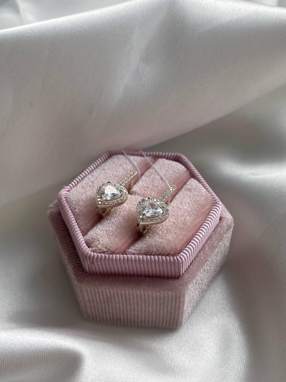 Срібні сережки у формі серця з білим камінчиком на англійській застібці "Жаклін"