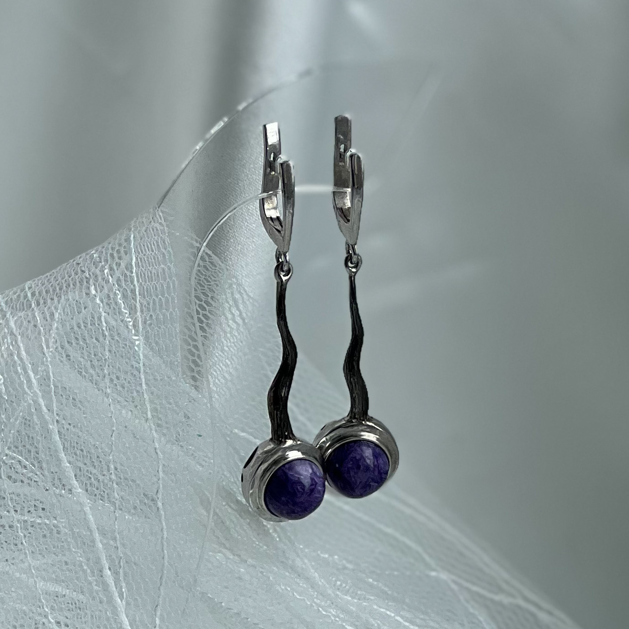 Сережки-підвіски зі срібла з фіолетовим чароїтом Mystic Bloom