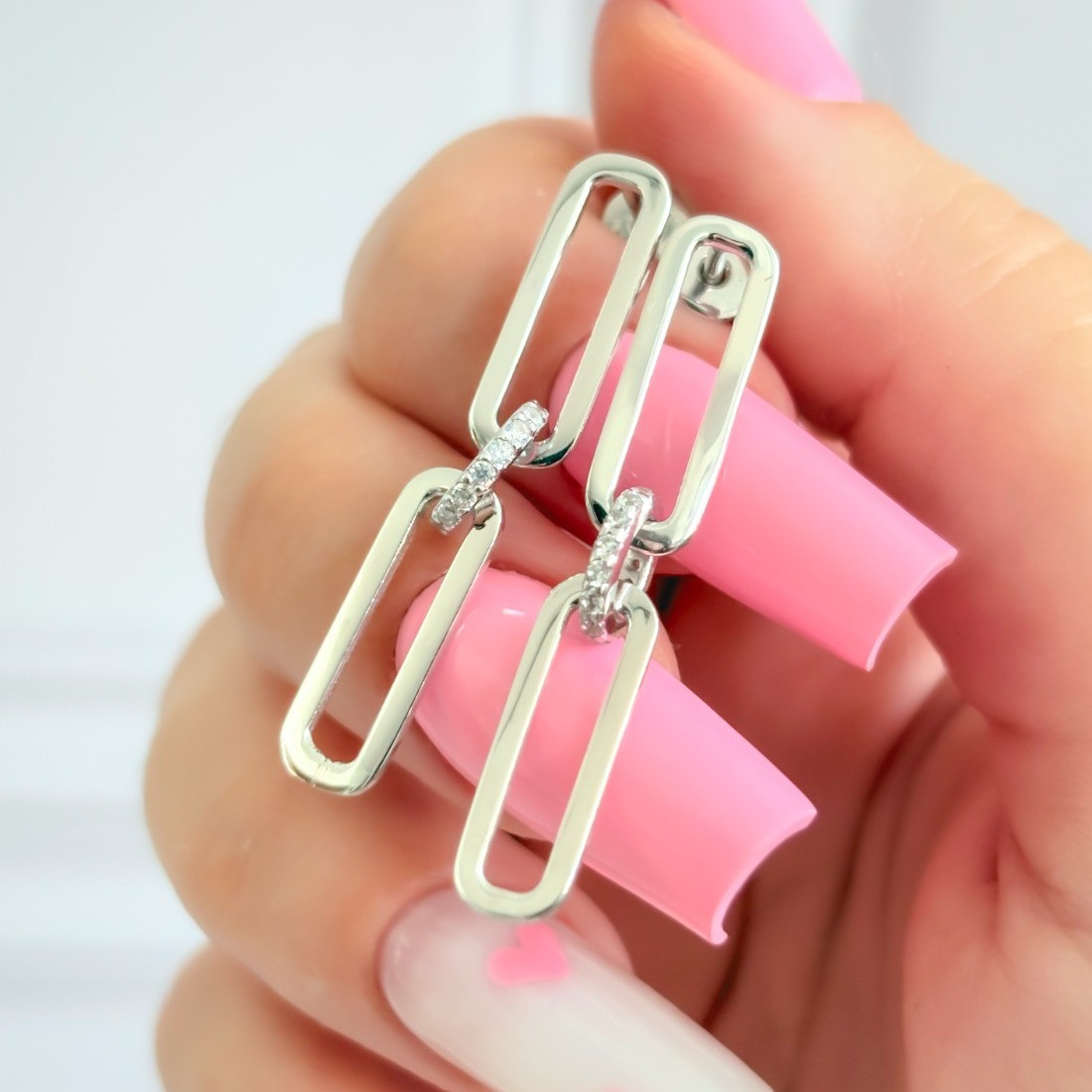 Підвіски виконані у формі подовжених скріпок з геометричним візерунком у стилі "меандр" — символу безкінечності та гармонії. Дизайн плоский, лінії чіткі, з акцентом на мінімалізм і легку графічність. Підвіска рухома, вільно коливається при ходьбі, додаючи динаміки образу.